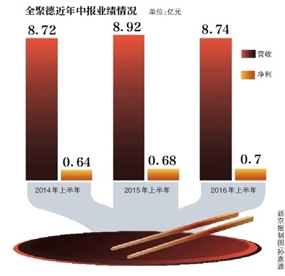 报告显示,2016年上半年,全聚德接待宾客357.76万人次,同比增长4.84%,但人均消费161.44元,同比下降2.62%。